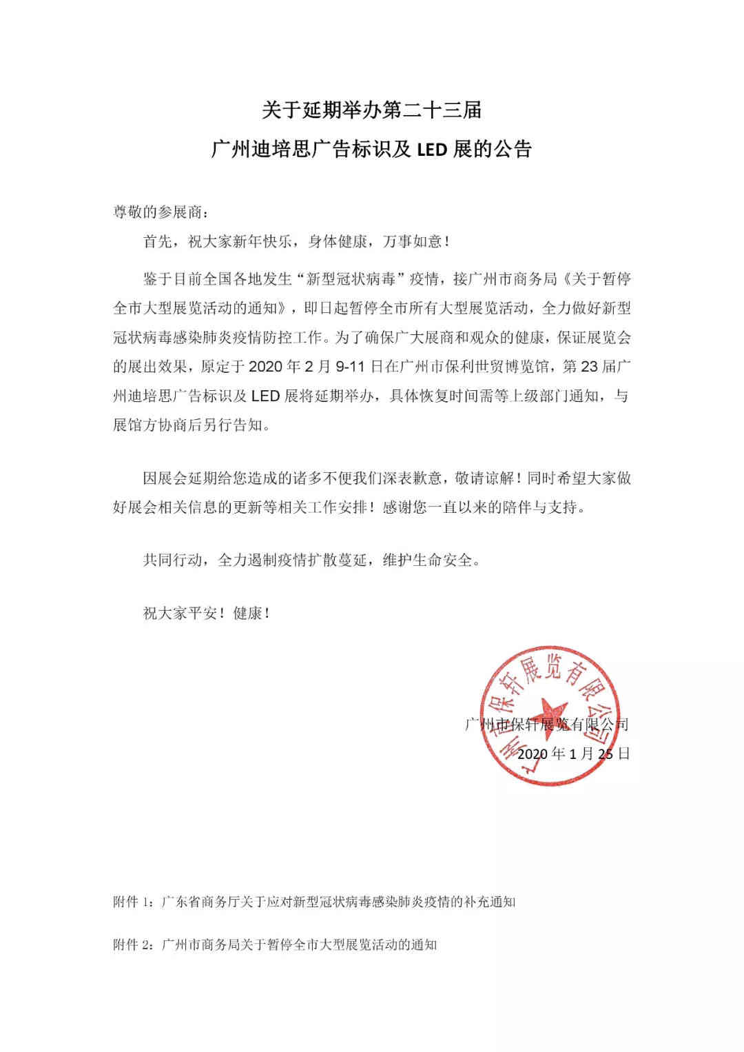針對(duì)目前“新型冠狀病毒”的疫情防控要求,接廣州市商務(wù)局《關(guān)于暫停全市大型展覽活動(dòng)的通知》,即日起暫停全市所有大型展覽活動(dòng),全力做好新型冠狀病毒感染肺炎疫情防控工作。為保障廣大展商和觀眾的健康,保證展覽會(huì)的展出效果,原定于2020年2月9-11日在廣州市保利世貿(mào)博覽館舉辦的“第23屆迪培思廣州國際廣告標(biāo)識(shí)及LED展”將延期舉辦,具體恢復(fù)時(shí)間將根據(jù)形勢(shì)發(fā)展第一時(shí)間另行通知。